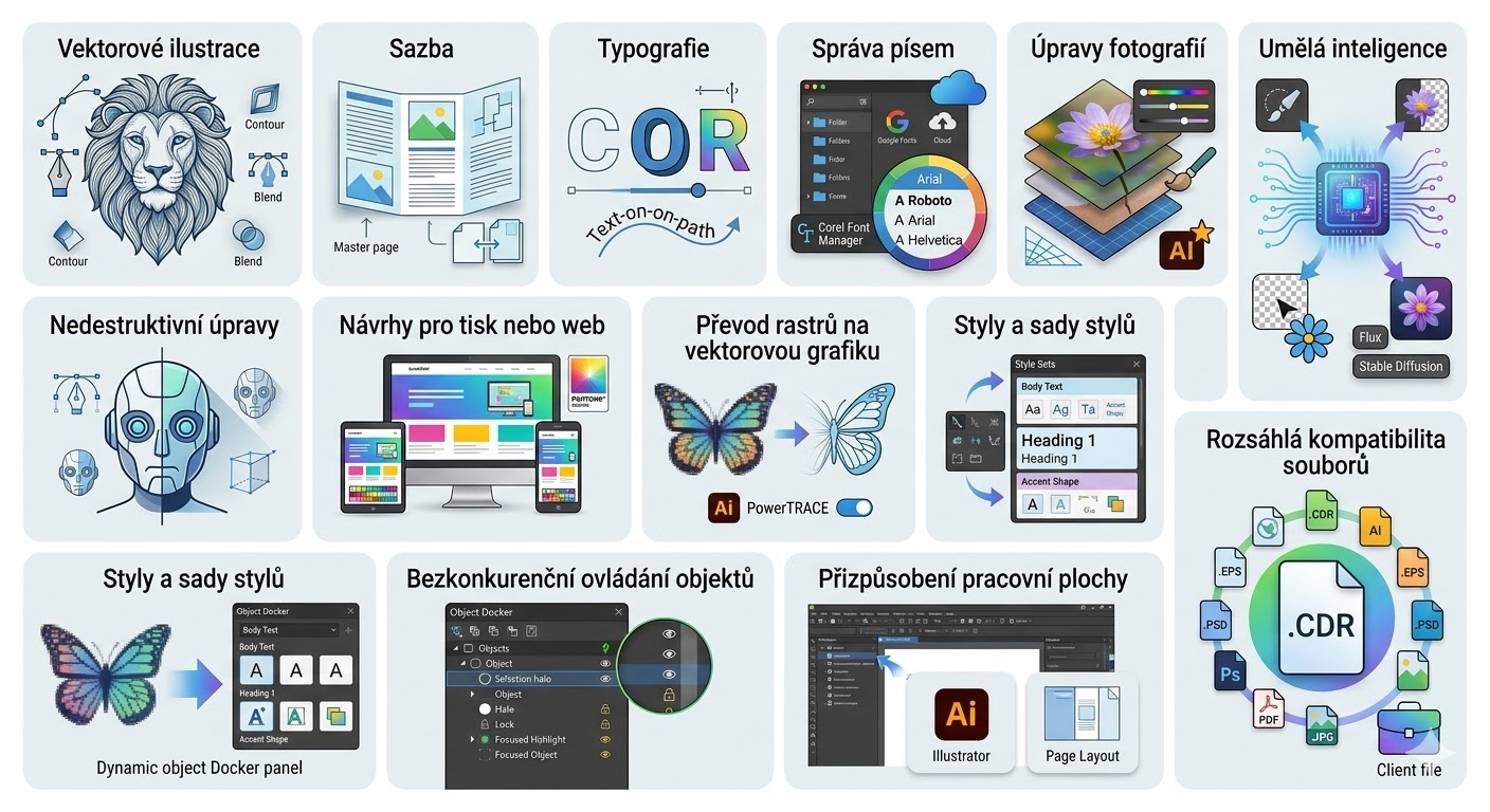 manuál, novinky a srovnání Díky novým funkcím a vylepšením je CorelDRAW Graphics Suite 2026 dosud nejinteligentnější verzí, která vám pomůže rychleji vytvářet originální návrhy a zároveň si zachovat plnou kreativní kontrolu. Vytvářejte obrázky pomocí umělé inteligence od nuly. Detailní informace najdete v 1073stránkovém PDF manuálu ZDE Vytvářejte jedinečné obrázky od nuly nebo z existujícího obsahu pomocí nového dokovacího modulu Generování AI v aplikacích CorelDRAW a Corel PHOTO-PAINT. Zadejte textový příkaz, vyberte si z modelů Flux, Stable Diffusion a Nano Banana AI, nastavte poměr stran a počet obrázků a použijte volitelné styly nebo palety barev. Maskujte fotografie pomocí AI Přesné maskování složitých objektů, jako jsou vlasy nebo jemné detaily, pomocí umělé inteligence, která automaticky identifikuje hrany objektu Remixujte obrázky pomocí AI Přeneste styl nebo kompozici z referenčního obrázku na svůj návrh pomocí pokročilých algoritmů. Odstraňte pozadí pomocí AI Inteligentní detekce objektů umožňující jedním kliknutím odstranit pozadí z fotografií přímo v pracovním prostředí srovnání CorelDRAW GS 2026 a starších verzí Uživatelé starších verzí jistě ocení srovnávací tabulku CorelDRAW GS 2026 ve verzi předplatného, časově neomezené licence a starších verzí CorelDRAW GS 2025 a 2024. Originální PDF dokument ZDE --- Český překlad (pomocí AI) ZDE Využití umělé inteligence (AI) Snaží se CorelDRAW nahradit uživatele umělou inteligencí? Rozhodně ne. Funkce AI Generate v CorelDRAW je navržena tak, aby vaši kreativitu podpořila, nikoli nahradila. Zavázali jsme se podporovat pracovní postupy umělců a udržovat lidské umění v centru všeho, co děláme. CorelDRAW ve skutečnosti prezentuje návrhy, které naši uživatelé vytvářejí, jako součást jejich značky tak, aby se zdůraznil jejich talent a zviditelnil je. Kolik kreditů AI získám s mou licencí? Společnost Corel přiděluje kredity na základě typu licence pro každý produkt. *Poznámka - Výše přidělených licencí pro produkty Corel se může změnit. Jak mám spravovat své kredity? Celkovou částku kreditů si můžete prohlédnout v sekci Kredity AI v sekci Můj účet. Na této stránce budou uvedeny všechny produkty a licence, které přispívají k celkovému zůstatku kreditů AI. Mohu si zakoupit další kredity? Ano! Další balíčky kreditů si můžete zakoupit ZDE. Zakoupené kreditní balíčky se zobrazí na kartě Doplňky v sekci AI kredity v sekci Můj účet. V tomto seznamu můžete spravovat opakované předplatné kreditních balíčků (zrušit, upravit fakturaci, znovu aktivovat) a zobrazit neopakující se (jednorázově zakoupené) kreditní balíčky. Nemám přístup k funkcím generativní umělé inteligence v mém produktu CorelDRAW. V čem je problém? Abyste mohli používat funkce generativní umělé inteligence, musíte přijmout zásady GenAI a potvrdit, že vám je 18 let nebo více. Pokud zásady nepřijmete, funkce nebudou fungovat. Pokud jste zásady přijali a stále se potýkáte s problémy, může dojít k dočasnému výpadku. Pokud problém přetrvává, nahlaste jej prosím našemu týmu podpory (coreldraw.com/support), který vám poskytne další pomoc. Mohu obrázky, které vygeneruji pomocí nástrojů CorelDRAW s umělou inteligencí, používat komerčně? Ano. Obrázky generované pomocí nástrojů CorelDRAW s umělou inteligencí lze použít komerčně. Obsah generovaný umělou inteligencí však nemusí být jedinečný a mohl by potenciálně porušovat práva třetích stran, včetně autorských práv, ochranných známek nebo práv na publicitu. Nesete výhradní odpovědnost za zajištění toho, aby obsah byl v souladu s platnými zákony a byl bezpečný pro komerční použití. Další oficiální informace naleznete v zásadách CorelDRAW Gen AI najdete ZDE a český překlad (pomocí AI) ZDE Specializované doplňky pro coreldraw bezplatný kreativní obsah Chcete-li nainstalovat bezplatný bonusový obsah do aplikace CorelDRAW, postupujte podle následujících kroků: Pokud chcete vidět vizuální pokyny k výše uvedeným krokům, podívejte se prosím na video ZDE. Profesionální návrhářské nástroje na dosah ruky Výkonné nástroje pro vektorové ilustrace v CorelDRAW můžete použít k přetvoření základních kontur a tvarů na komplexní umělecká díla. S všestrannými nástroji pro tvary a kreslení můžete vytvářet různé křivky. S nástroji efektů, jako jsou Kontura, Obálka, Prolnutí, Síťová výplň a další, můžete do vektorových děl přidávat kreativní efekty. Sazba Najdete zde všechny nástroje, které potřebujete k vytváření stránkového zlomu pro brožury, vícestránkové dokumenty a další. Přepínejte mezi úpravami jedné a více stránek, což vám nabízí možnost pracovat tak, jak chcete. Typografie Komplexní sada typografických nástrojů vám umožní pracovat s textem dle vlastních představ. Doplňte text o efekty, jako jsou blok stínu a obrysy. Dolaďte citlivě písma díky podpoře variabilních písmen, umístěte text na osnovu a využijte i další možnosti. Správa písem Organizujte a spravujte knihovnu písem s intuitivní aplikací Corel Font Manager a používejte svá oblíbená písma, aniž byste je museli instalovat. Pracujte rychleji s písmy uloženými v síti a využijte přímý přístup k více než 1 700 písem Google Fonts. Úpravy fotografií S výkonnými nástroji pro úpravu fotografií na základě vrstev v aplikaci Corel PHOTO-PAINT můžete přizpůsobit barvy a tóny, odstranit nedokonalosti, opravit perspektivu a dělat mnoho dalšího. Vylepšete velikost a kvalitu obrázků s využitím umělé inteligence. Umělá inteligence Zrychlete svůj pracovní postup pomocí výkonných nástrojů AI, kte
